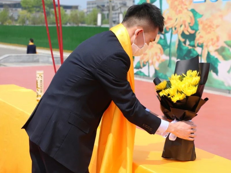 ????绵阳泛美飞行职业技术学校教师代表陈闯先生代表全体师生向革命先烈敬献黄菊花。