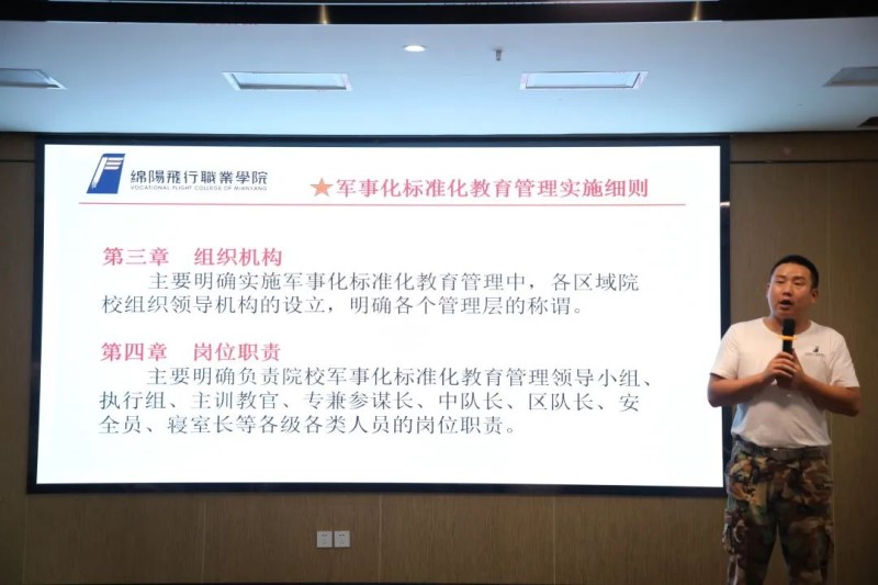 ????此次军训分为飞工学院、航服学院、消防与智能学院和行政四个方队,每个方队由教官负责组织训练。绵阳飞行职业学院军体总教官车太生进行训前动员,传达集团关于教职员工军事训练的文件精神,并提出具体要求: