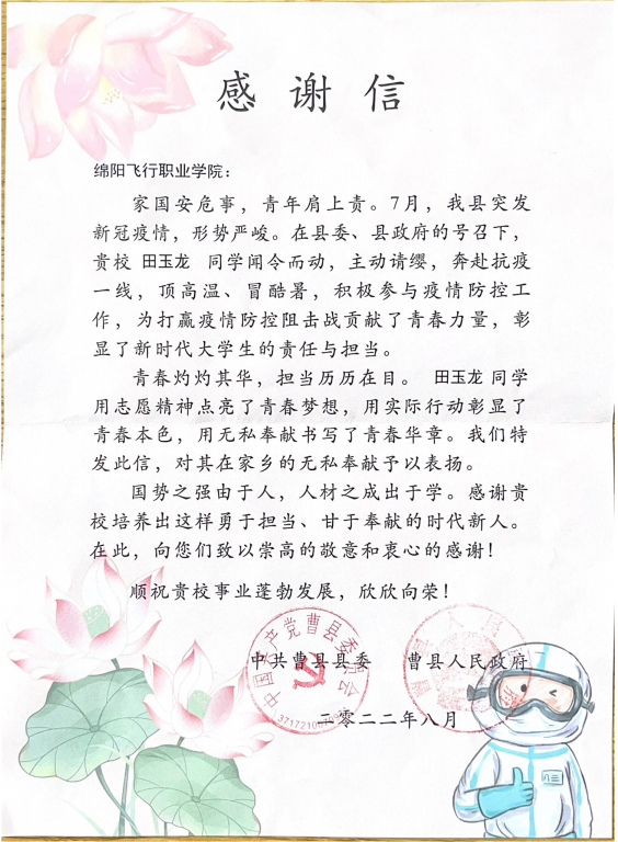 ????9月20日,学院收到了一封特殊的信件——来自“中共曹县县委”与“曹县人民政府”的感谢信,对我院学子田玉龙同学在疫情防控中展现出的责任与担当予以表扬。国势之强由于人,人材之成出于学,对我院培养出这样勇于担当、甘于奉献的时代新人予以感谢。