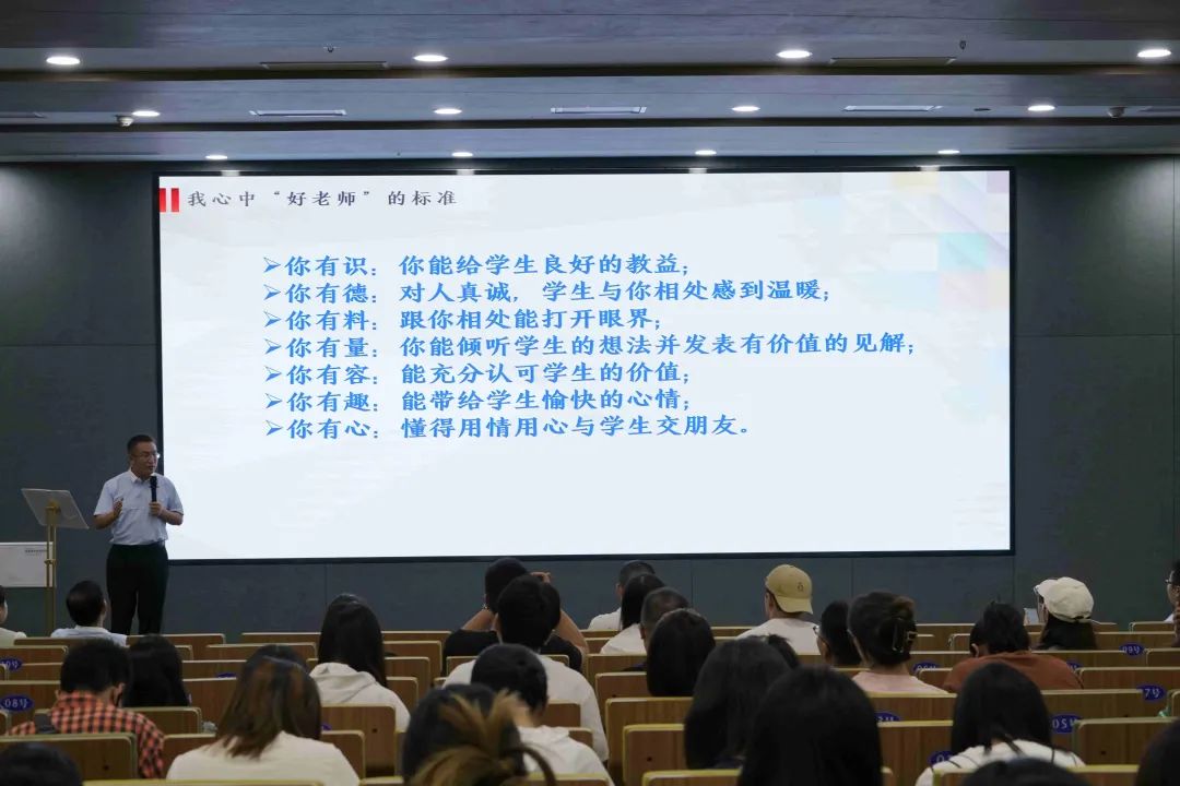 ????好老师就是好的教育。 梁国辉副院长指出, 现代教师观启示我们要学习现代化教育理念,以科学的态度、睿智的方法,有趣的知识和技能带给学生实用的技巧和快乐。要做一个有识(你能给学生良好的教益)、有德(对人真诚,学生与你相处感到温暖)、有料(跟你相处能打开眼界)、有量(你能倾听学生的想法并发表有价值的见解)、有容(能充分认可学生的价值)、有趣(能带给学生愉快的心情)、有心(懂得用情用心与学生交朋友)的好老师。