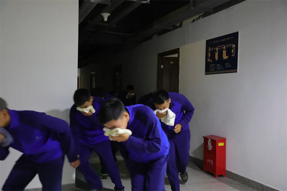 ????火灾警报拉响,龙堡教学楼仿真火灾点位突然浓烟弥漫,楼内各疏散口、楼梯口等重点区域的引导员迅速就位,师生们捂住口鼻、弯腰低姿态沿疏散标识所示方向有序完成疏散。