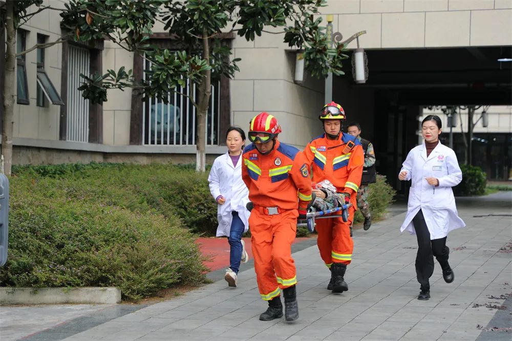 ????应急联动,精准对接。为了增强火灾场景真实性,深度提升全校师生的参与感,本次消防疏散演练邀请了北川消防大队消防官兵进行联合演练。北川羌族自治县消防大队接到“报警”后,派出多名消防员和4辆消防特种车迅速赶到。确认“火情”发生点后,消防员迅速准备灭火装备和救援设施到达学生公寓五楼,现场营救受困学生。受困学生安全撤离后,消防车启动水炮车对高楼层进行灭火,很快火势被控制并扑灭,整个演练过程顺利结束。