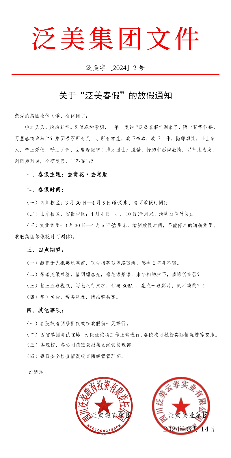 ????桃之夭夭,灼灼其华。又值春和景明,一年一度的“泛美春假”到来了,陌上繁华似锦,万里春情谁与共?集团号召所有员工、所有学生,放下书本,放下工作,抛却烦忧,带上家人,带上爱侣,呼朋引伴,去度春假吧!揽万里山河胜景,抒胸中澎湃激情,以草木为友,用脚步写诗,全薪度假,它不香吗?