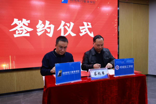 仪式上,潘江主任与滕跃清局长分别讲话,对两校协作寄予殷切期望,希望以“蓝鹰工程”为重要纽带,进一步深化浙川两地教育协作,为区域产业发展输送更多高素质技能人才,赋能地方经济社会发展。随后,绵阳飞行职业学院执行院长梁国辉与柯城技工学校招生处主任郭红国代表双方签署合作协议。
