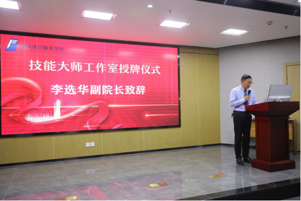仪式伊始,李选华副院长发表致辞,他指出,技能大师工作室的建设既是学校响应省市高技能人才发展规划、服务航空、汽车等相关产业升级的关键举措,也是强化学校高技能人才队伍建设的重要抓手。他明确,学校将为工作室专属的场地及全方位的资源配套提供支持,并期望各工作室能聚焦技术革新、人才培养与校企合作三大核心任务,为学校人才培养质量提升注入新动能。