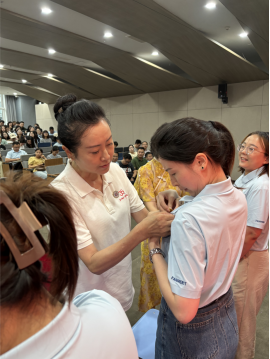 “青蓝协约”环节将仪式气氛推向高潮。舞台上,6位导师代表为青年教师代表佩戴刻有“绵飞院青蓝工程”字样的专属徽章——蓝色代表资深教师的沉稳与专业,青色象征青年教师的活力与潜力,两种颜色交织,寓意“青出于蓝而胜于蓝”。台下,其他导师也逐一为结对青年教师佩戴徽章,师徒眼神中满是信任与期许,相机定格下这一充满仪式感的瞬间。