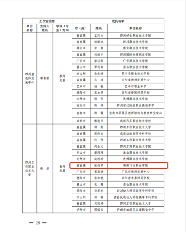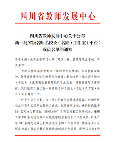 近日,四川省教师发展中心正式公布新一批省级名师名校长(名匠)工作室(平台)成员名单,我院教师发展中心副主任张剑琴凭借扎实的专业素养、丰富的教学管理经验,成功入选四川省第五批职业教育名师工作室成员,这对促进我院教师队伍建设,引领教师成长具有重要的意义。