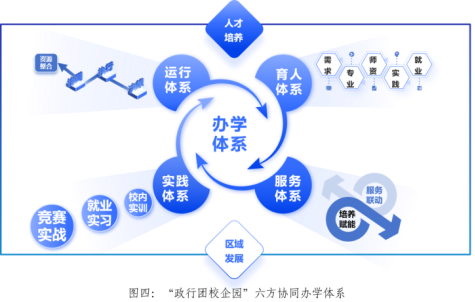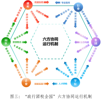 1.六方协同办学模式创新。突破传统“政行企?!彼姆交颉罢F蟆比叫窒?,将集团与园区纳入协同主体,形成六方协同模式,实现行业“出题”、校企“共答”、政府“监考”、产业“阅卷”、集团“保障”的办学闭环。